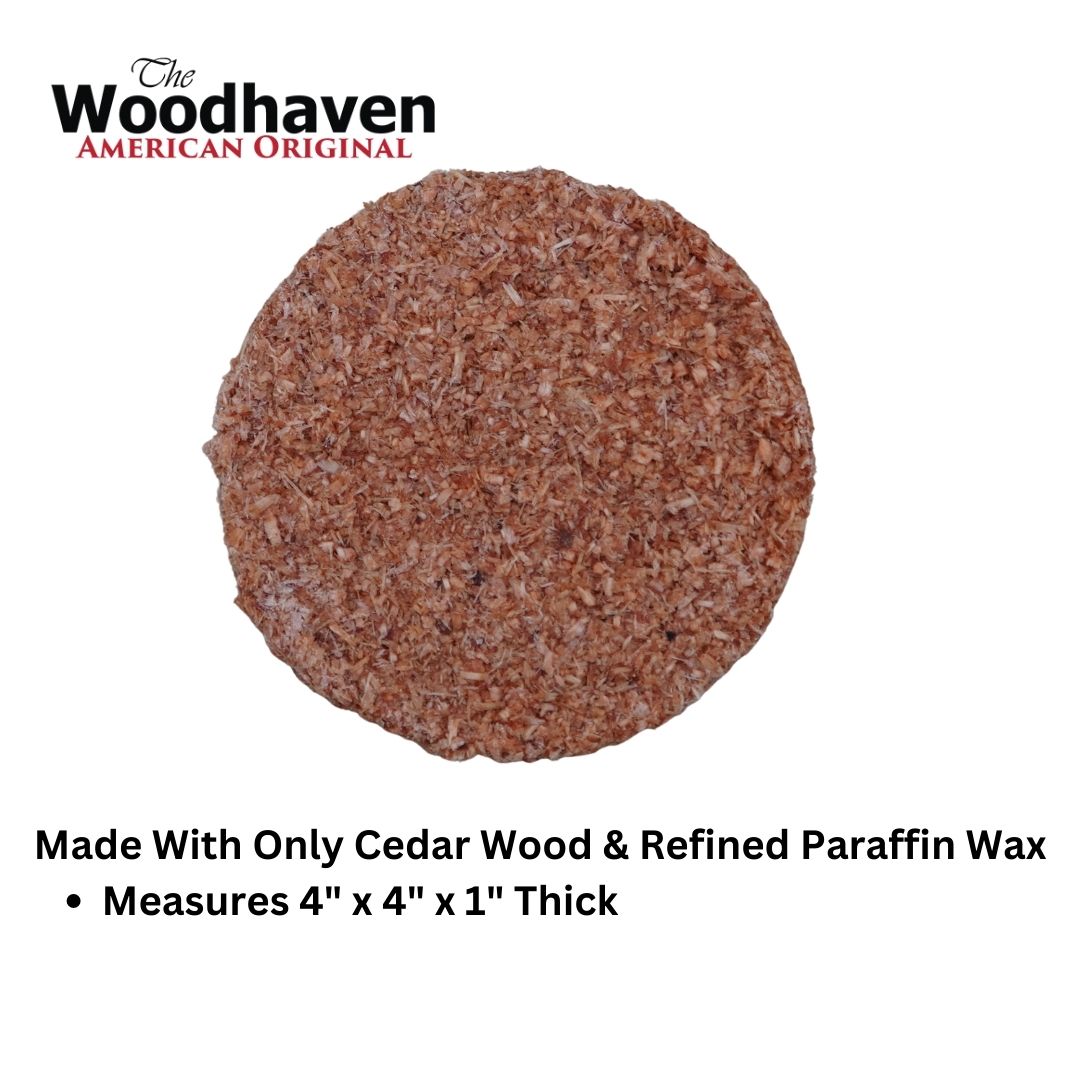 The Woodhaven Fire Starters are a 4" x 1" disk made from cedar sawdust and highly refined wax here in the USA. They leave no residues or toxic chemicals behind. Simply light the edge with a match and each starter will burn for 20-30 minutes. Keep it pure with Woodhaven starters. One starter can be broken apart to start multiple fires!