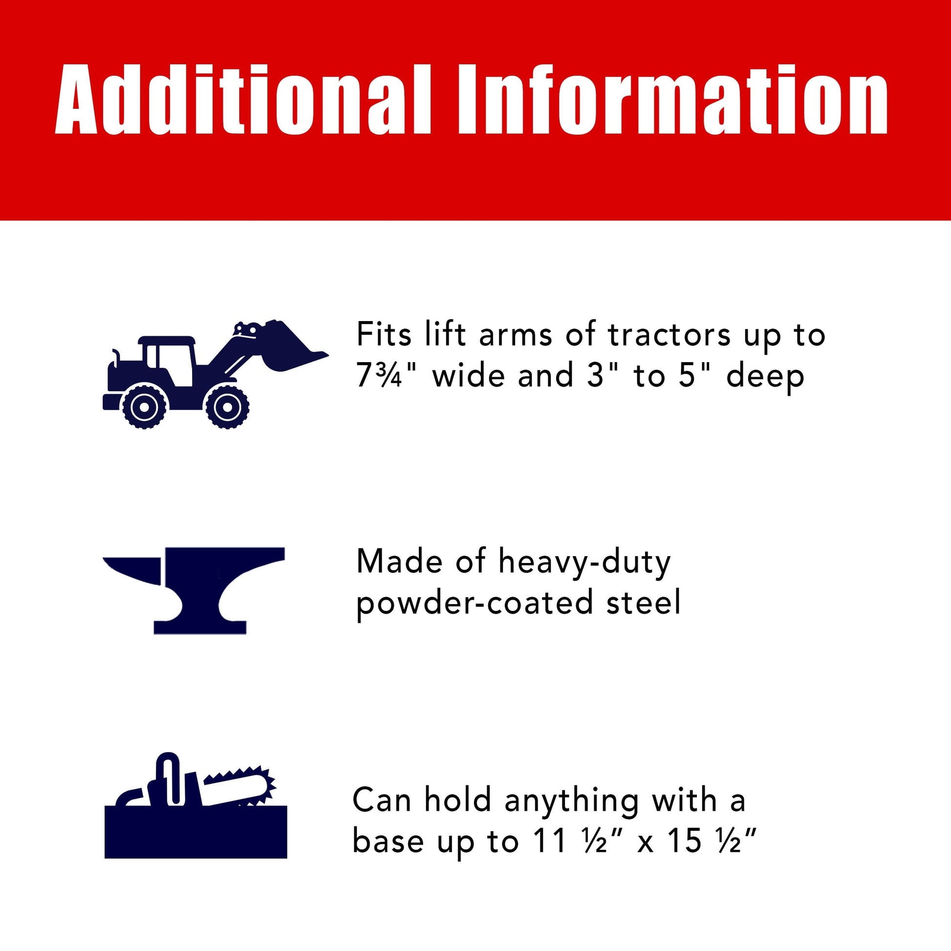 Large Mount Size: Fits the lift arms of most compact and sub-compact tractors with a lift arm up to 12" wide and 6" deep.
