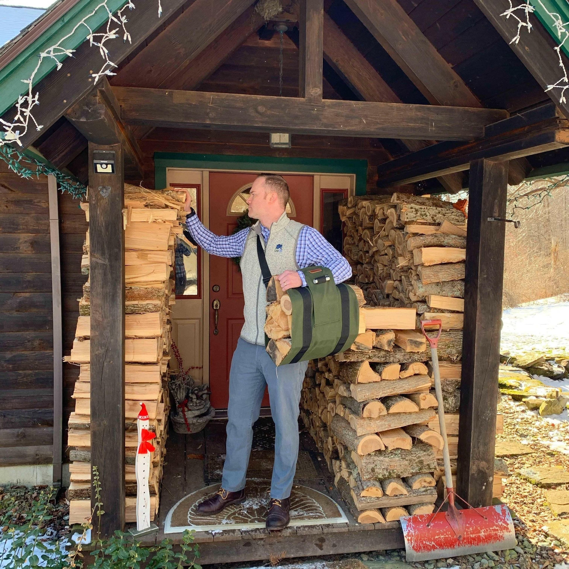 Unlike using typical two-handled firewood bags or awkward armloads of wood, the WoodOX Sling securely carries firewood at your side, distributing the weight across your shoulders like a messenger bag. This simple shift dramatically reduces strain on your body and makes walking indoors much easier.